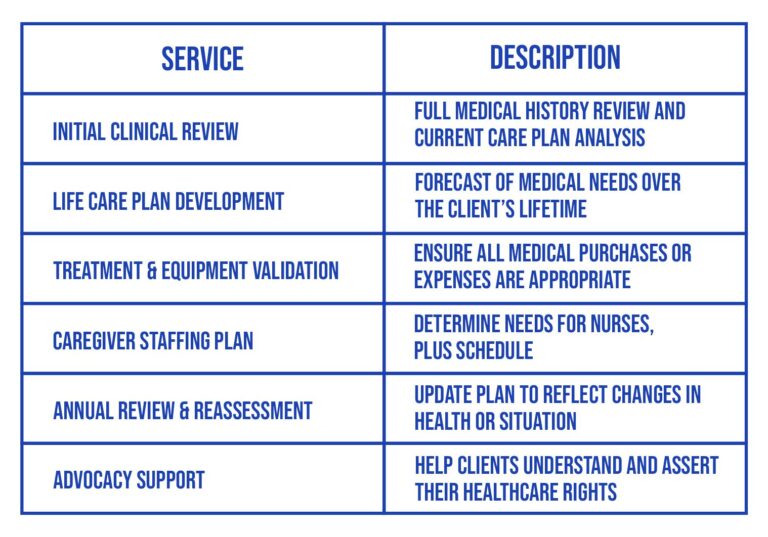 • Ensuring the client’s health needs are adequately represented in legal and financial planning documents, e.g., trust fund setup, structured settlement usage.